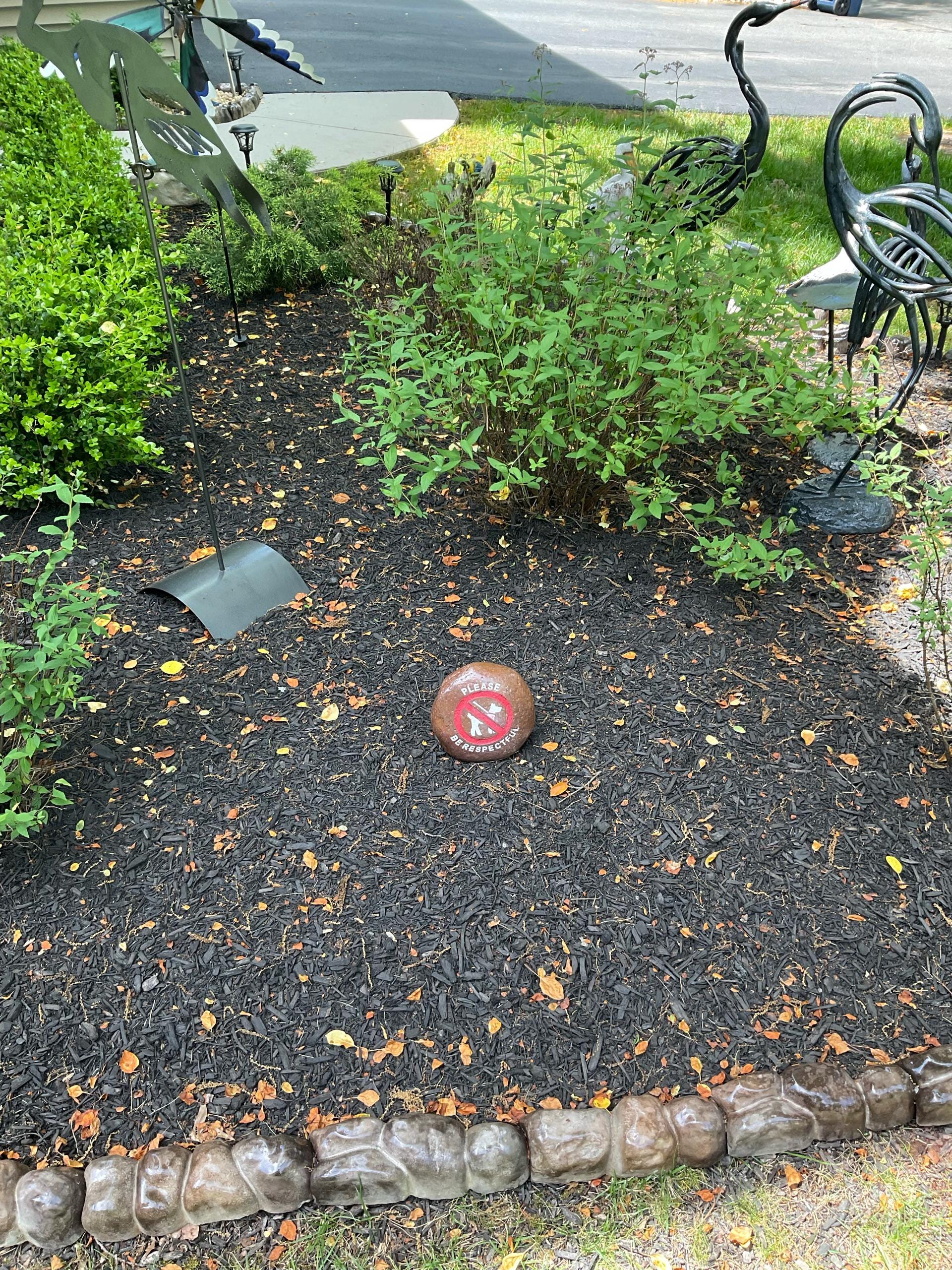 This rock is a beautiful and polite way to let our neighbors know not to let their dogs do their business in our yard. We also brought the red+white reflective rock too. Both rocks are very nicely done and are very heavy too. We just love the way they look in our yard! We appreciated the way that we were communicated with also.