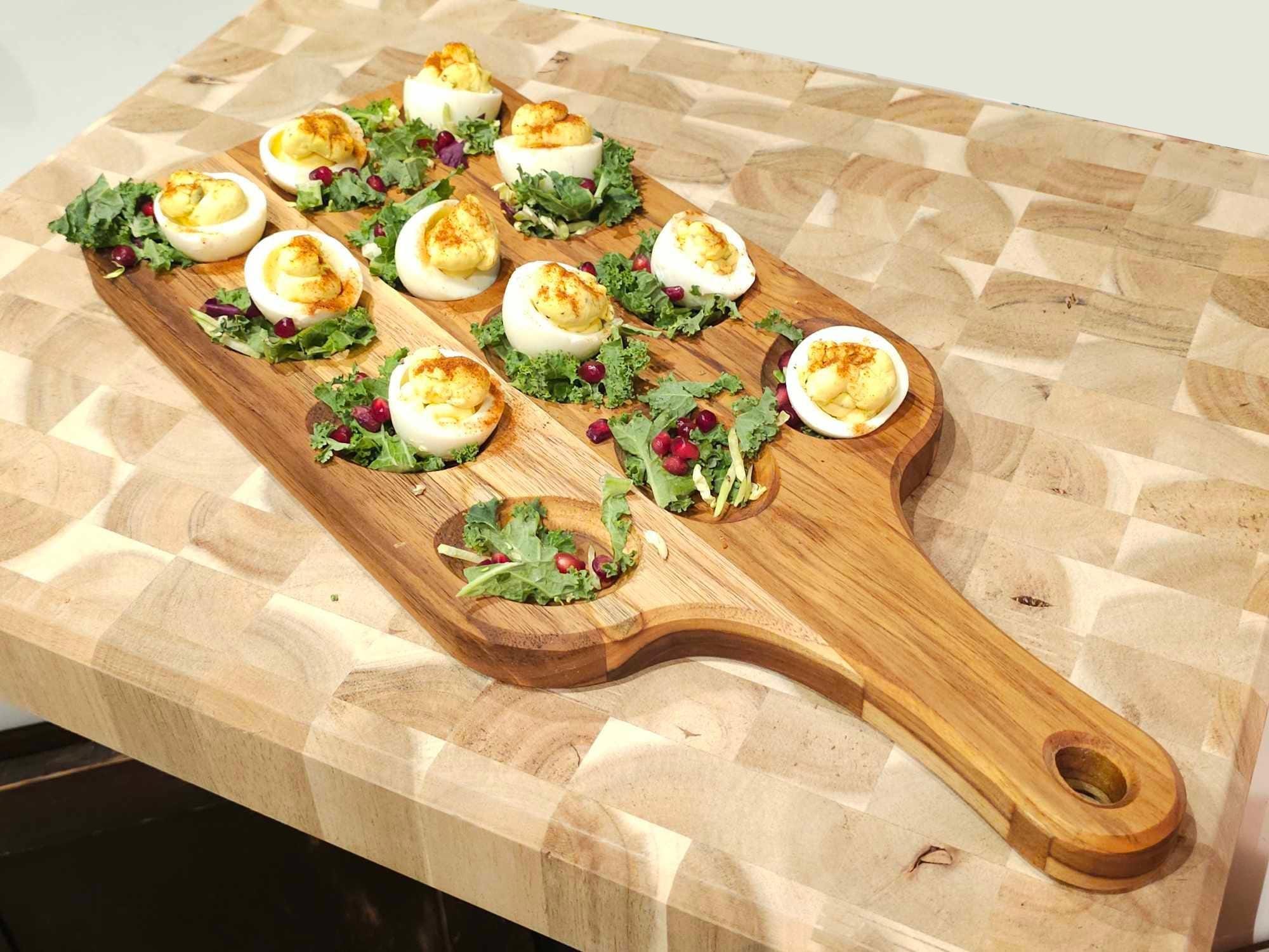 Two Sided Charcuterie Board: One side is for Deviled Eggs & Other Side is for Serving or Butterboard | Beautiful Water-Resistant Teak Wood!