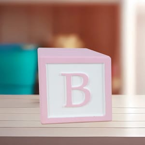 Our classic alphabet piggy banks are precision cut and hand painted to be the cutest focal point for your nursery decor! Made from engineered wood so they never warp or crack, our letter blocks make beautiful decorations for your baby showers, christening, or for your baby's little sanctuary. Available in 2 color schemes: MATTE pastels -OR- GLOSS primary colors -- both are painted against a WHITE background. Includes black rubber stopper to empty your treasures.