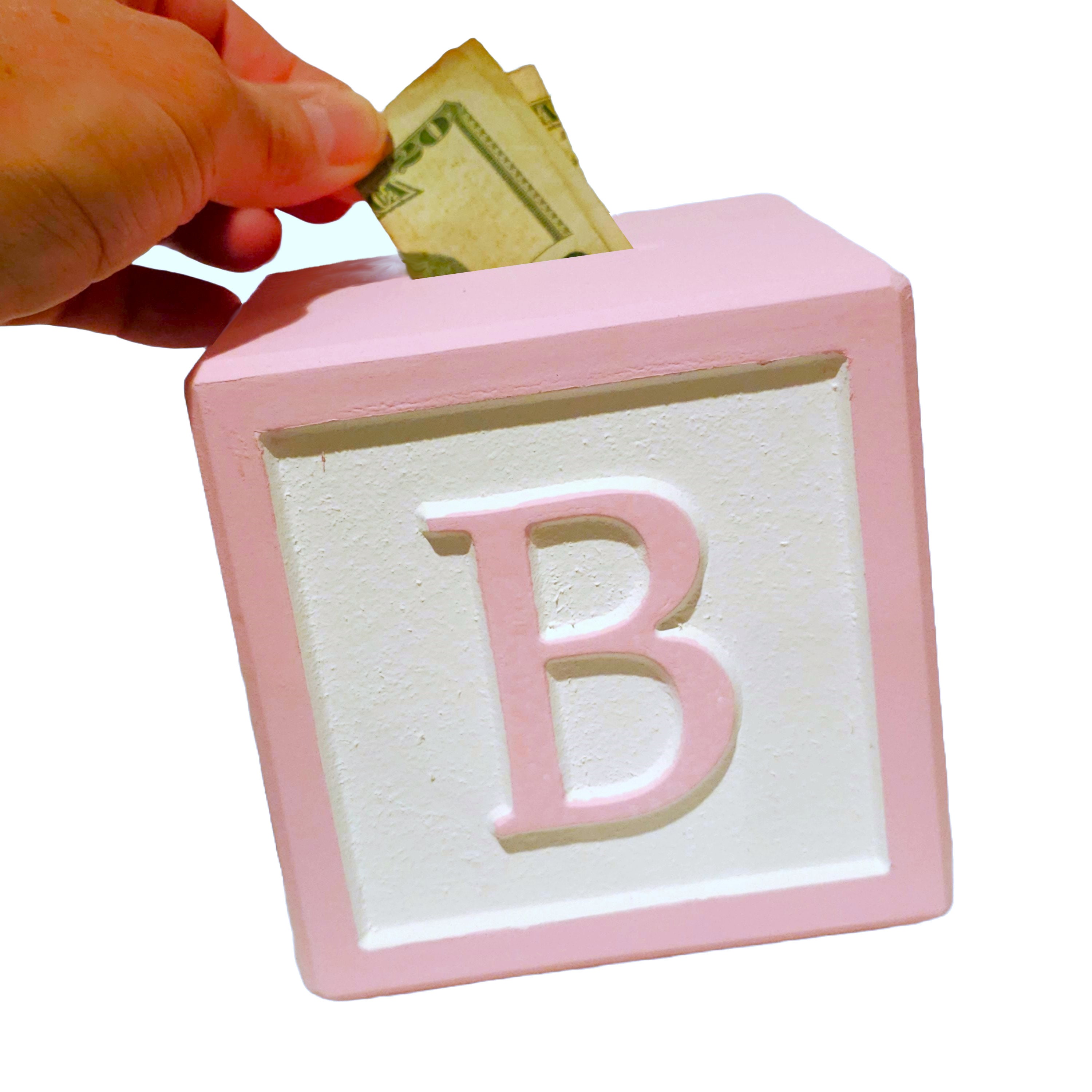 Our classic alphabet piggy banks are precision cut and hand painted to be the cutest focal point for your nursery decor! Made from engineered wood so they never warp or crack, our letter blocks make beautiful decorations for your baby showers, christening, or for your baby's little sanctuary. Available in 2 color schemes: MATTE pastels -OR- GLOSS primary colors -- both are painted against a WHITE background. Includes black rubber stopper to empty your treasures.