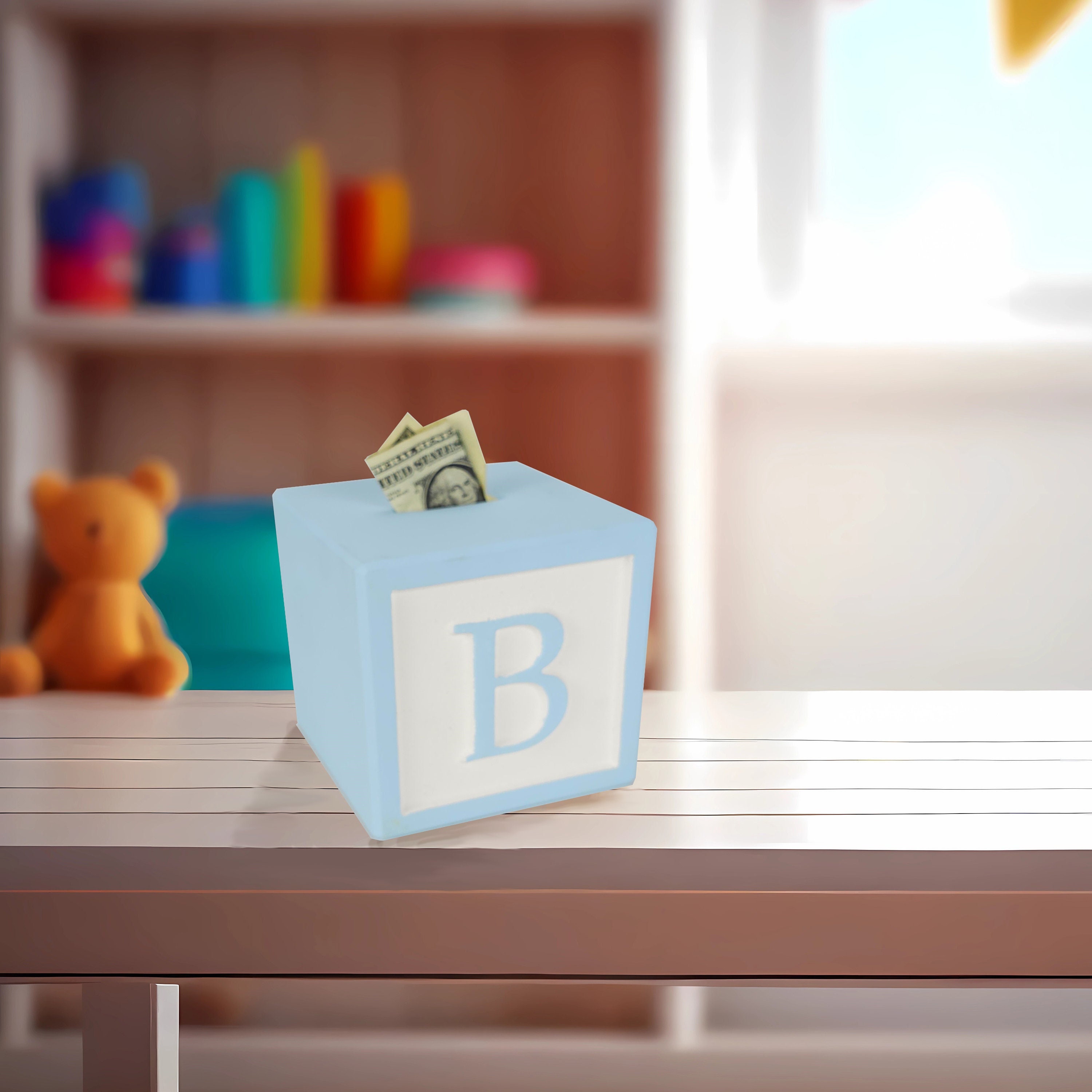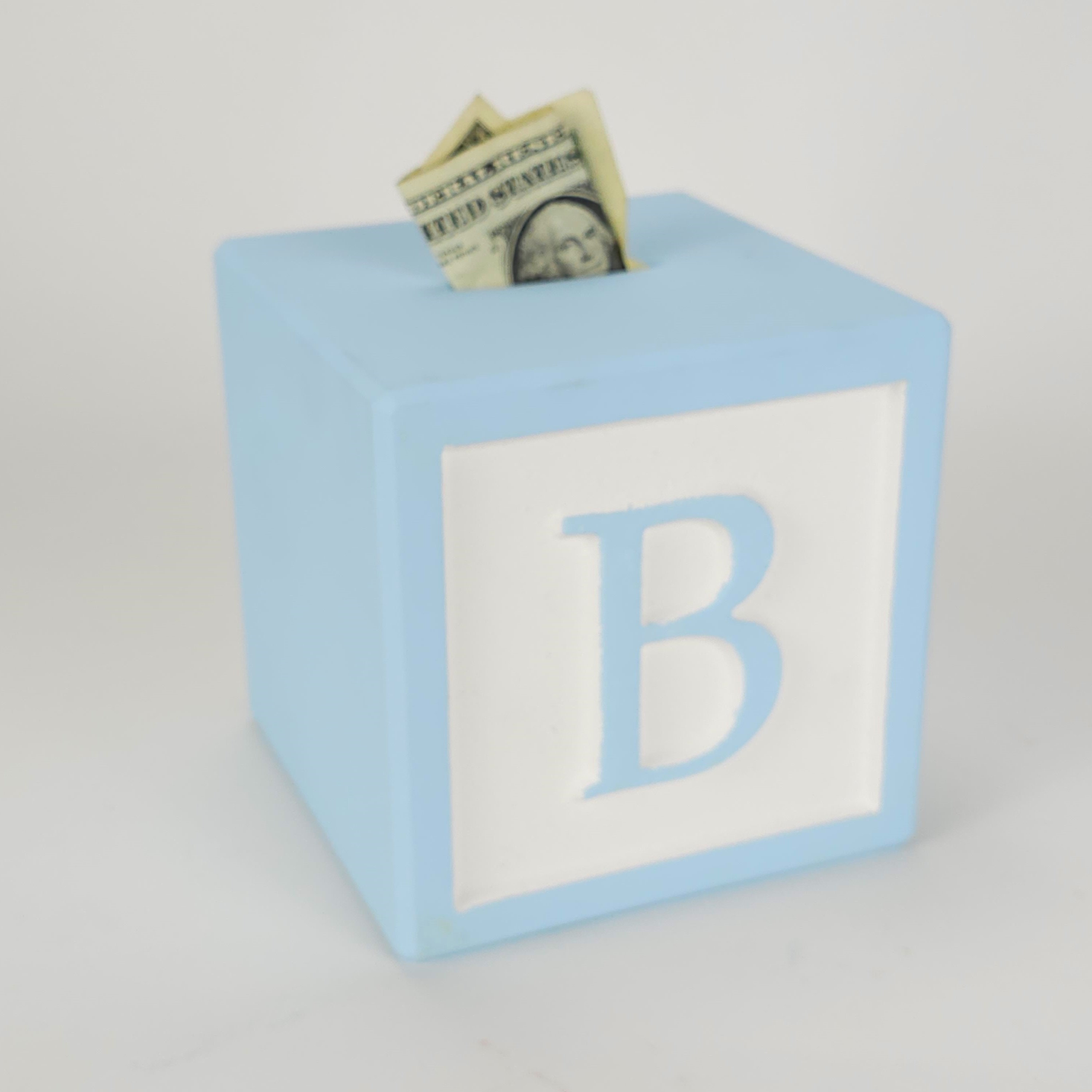 Traditional Wooden Letter Block Piggy Banks for Boys. This Classic Design Makes Beautiful Nursery Decor and Best Seller Baby Gifts