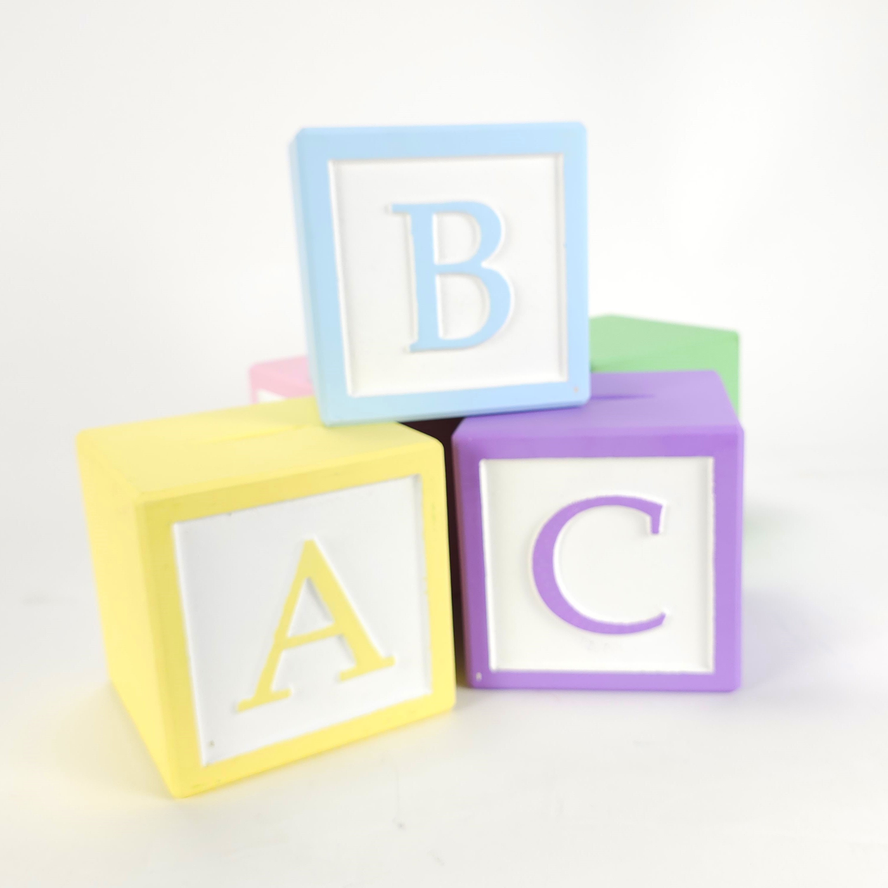 Our classic alphabet piggy banks are precision cut and hand painted to be the cutest focal point for your nursery decor! Made from engineered wood so they never warp or crack, our letter blocks make beautiful decorations for your baby showers, christening, or for your baby's little sanctuary. Available in 2 color schemes: MATTE pastels -OR- GLOSS primary colors -- both are painted against a WHITE background. Includes black rubber stopper to empty your treasures.