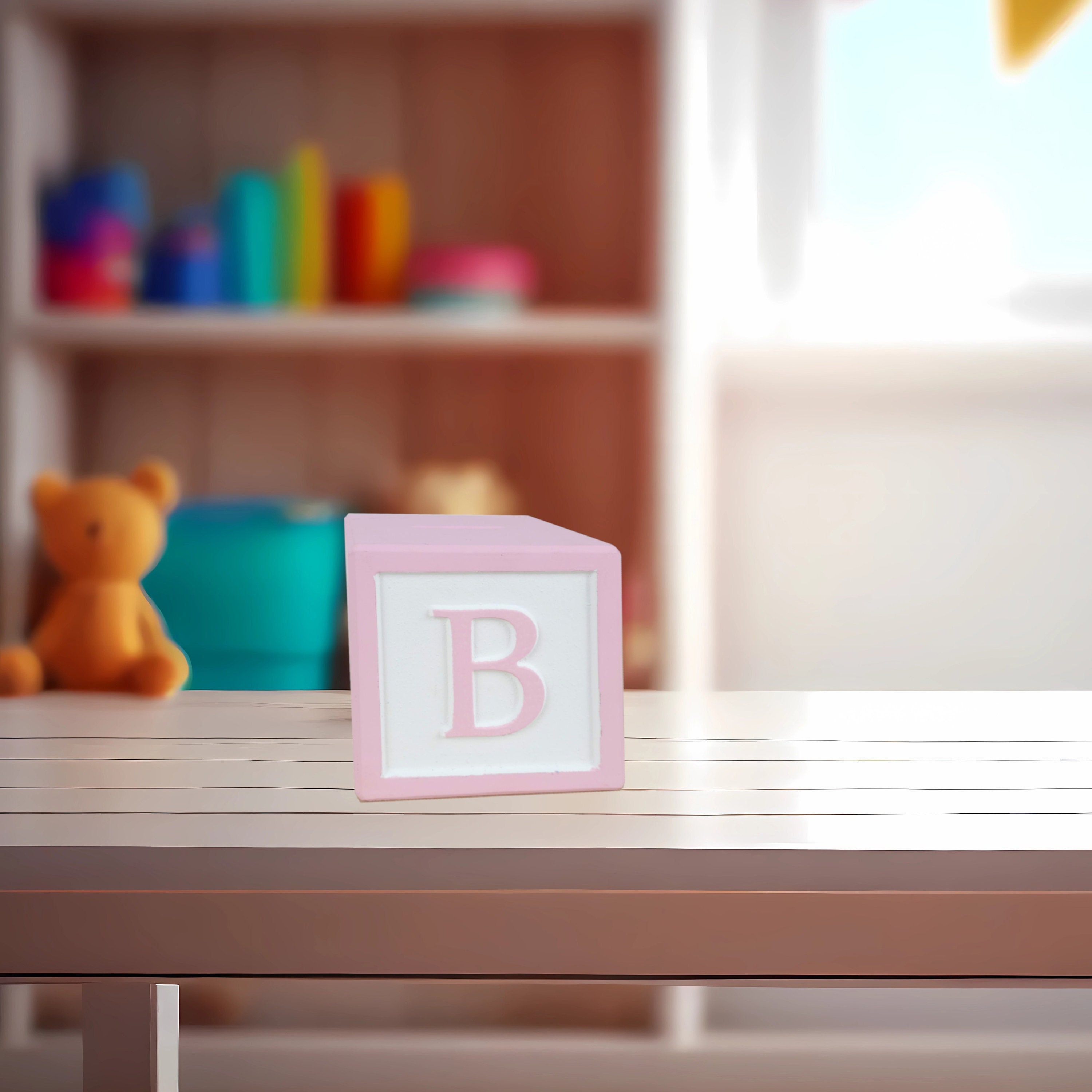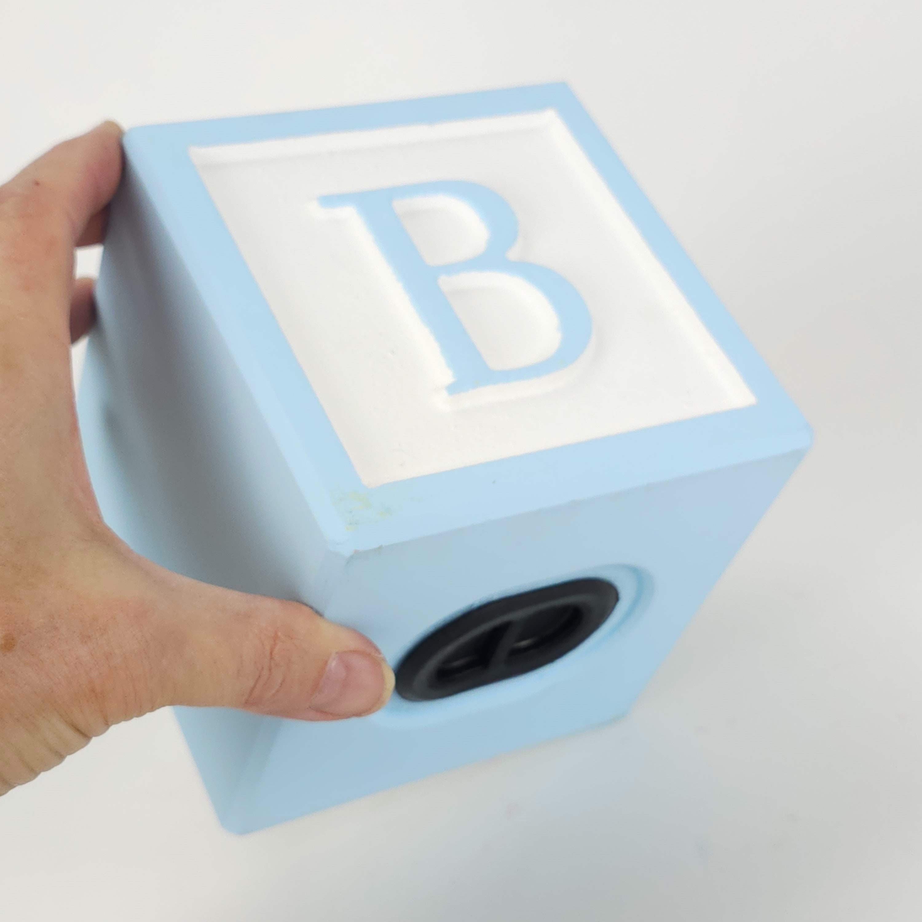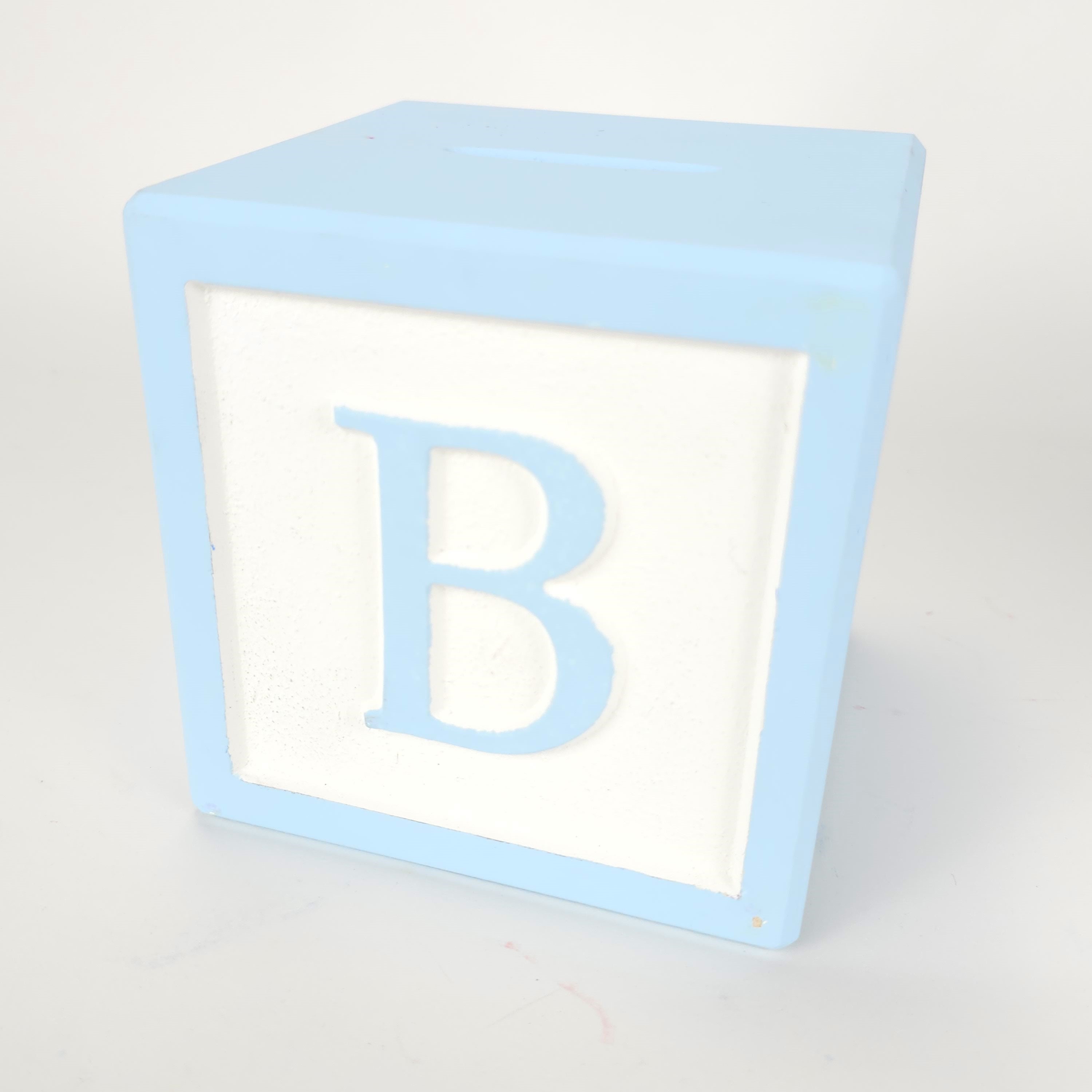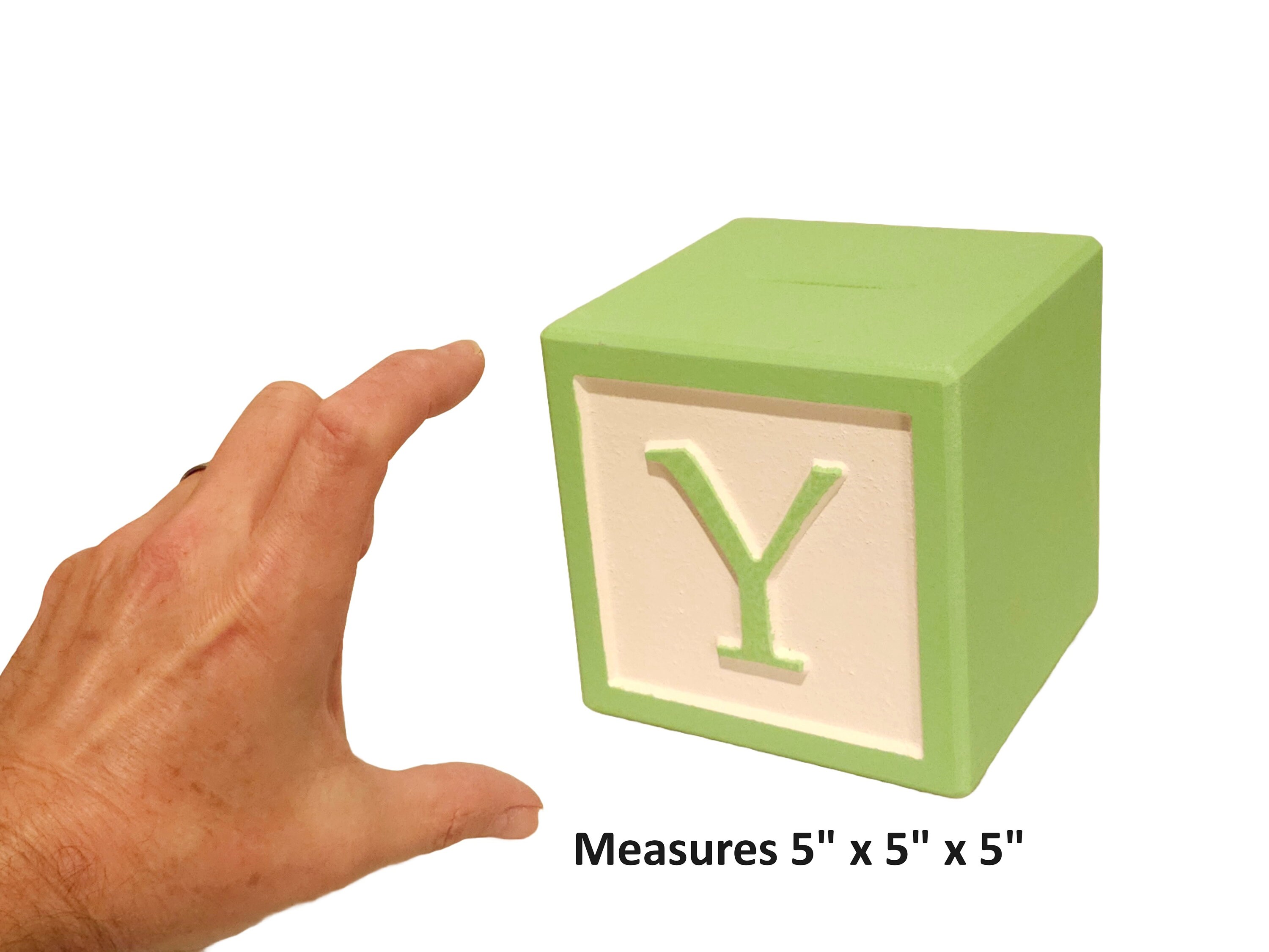 Our classic alphabet piggy banks are precision cut and hand painted to be the cutest focal point for your nursery decor! Made from engineered wood so they never warp or crack, our letter blocks make beautiful decorations for your baby showers, christening, or for your baby's little sanctuary. Available in 2 color schemes: MATTE pastels -OR- GLOSS primary colors -- both are painted against a WHITE background. Includes black rubber stopper to empty your treasures.