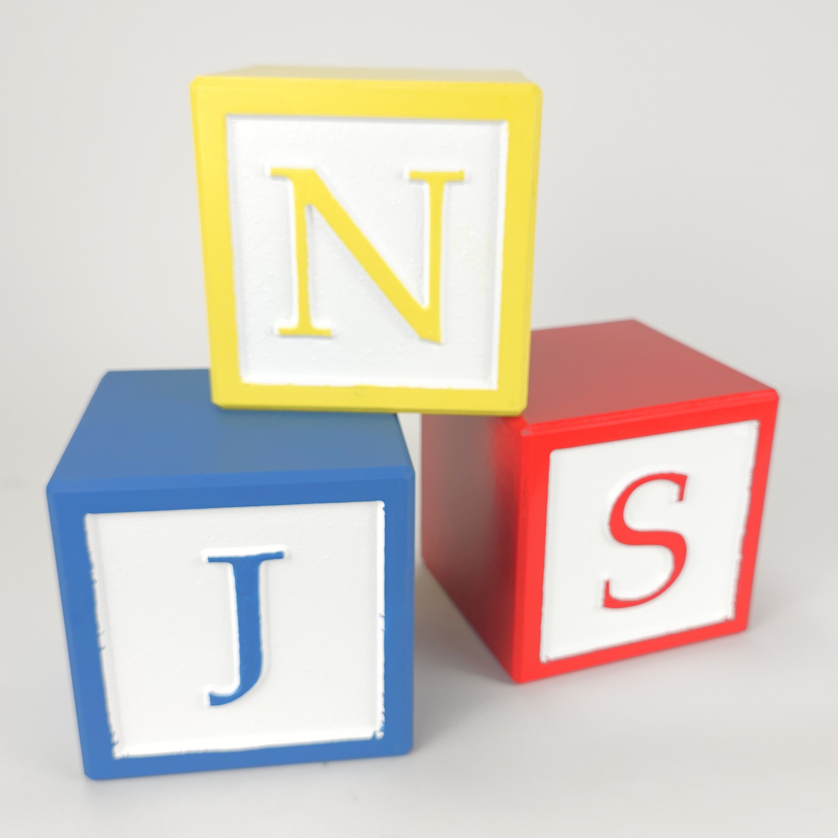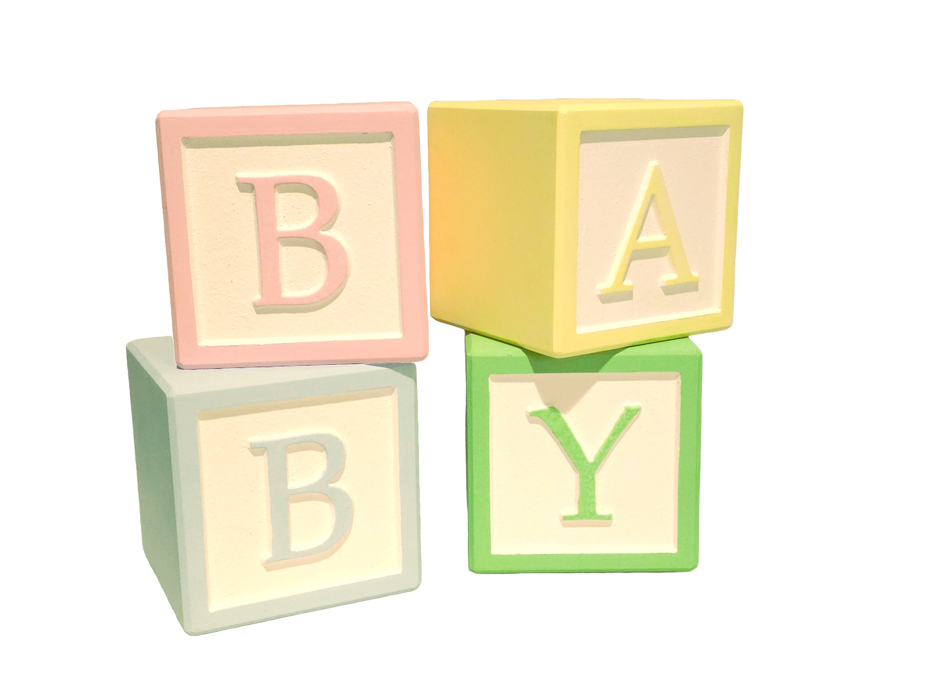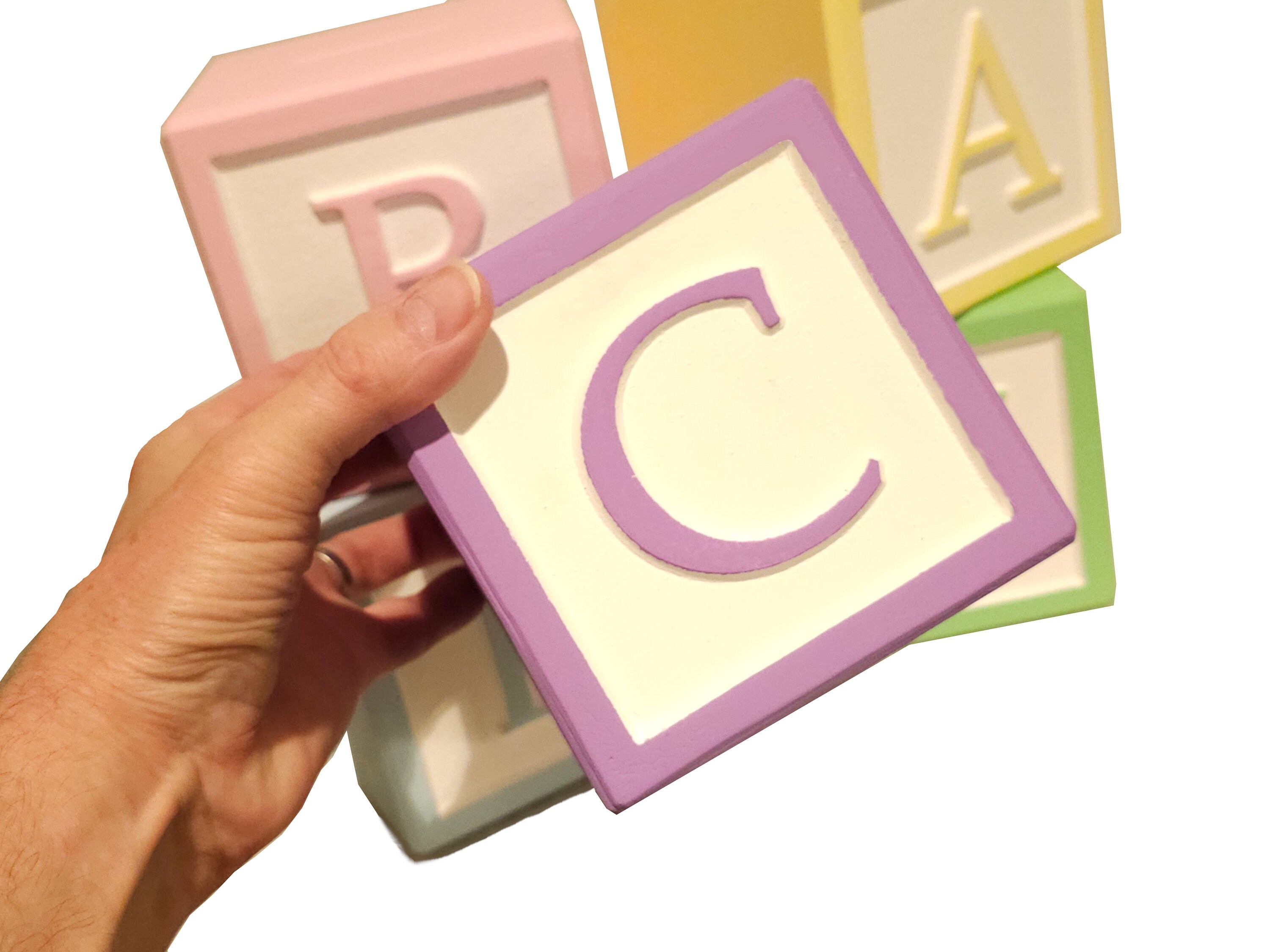 Our classic alphabet blocks are precision cut and hand painted to be the cutest focal point for your nursery decor! Made from engineered wood so they never warp or crack, our letter blocks make beautiful decorations for your baby showers, christening, or for your baby's little sanctuary. Available in 2 color schemes: MATTE pastels -OR- GLOSS primary colors -- both are painted against a WHITE background.