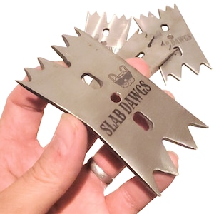 Yeah, they're kind of ugly yet they're going to be one of the MOST USEFUL tools in your CNC- and carving-toolbox. Made from 1/8" stainless steel and bent along its center, our SLAB DAWGS bench dogs can be used for limitless clamping possibilities. Use YOUR OWN screws - we've opted to NOT include screws because of the unlimited possibilities of the base you're clamping to. Plan to drive a screw 1/2"-to-3/4" (or more) into the clamping base...